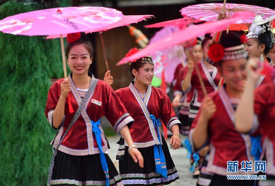 在广西融水双龙沟森林旅游度假区梦呜苗寨,搬迁过来的苗族姑娘准备给游客表演民族舞蹈(6月21日摄)。近年来,融水打造原生态苗族文化体验园——梦呜苗寨,让搬迁进城的贫困户住进复原建设的老房子。景区提供绿化保洁、游乐设施管理、民族歌舞表演等工作岗位,多渠道增加贫困户收入。新华社记者黄孝邦摄