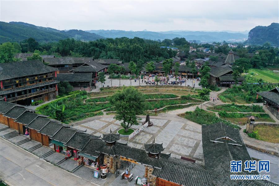 这是广西融水双龙沟森林旅游度假区梦呜苗寨(无人机照片,6月21日摄)。近年来,融水打造原生态苗族文化体验园——梦呜苗寨,让搬迁进城的贫困户住进复原建设的老房子。景区提供绿化保洁、游乐设施管理、民族歌舞表演等工作岗位,多渠道增加贫困户收入。新华社记者黄孝邦摄
