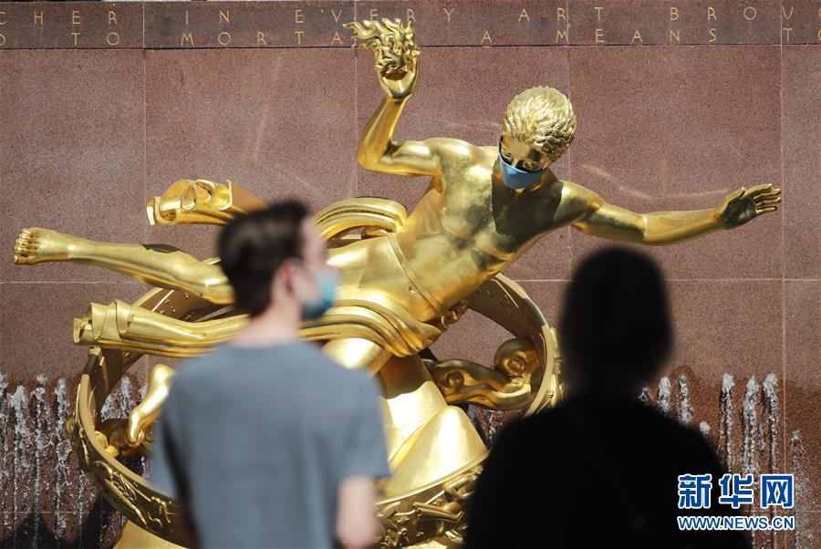 6月22日,在美国纽约洛克菲勒中心,一座雕像被“戴”上口罩。美国约翰斯·霍普金斯大学22日发布的新冠疫情最新统计数据显示,美国累计死亡病例超过12万例。新华社记者王迎摄