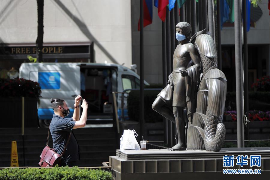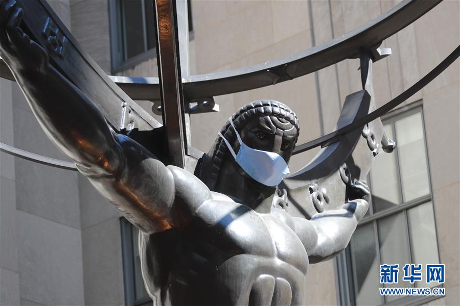 6月22日,在美国纽约洛克菲勒中心,一座雕像被“戴”上口罩。美国约翰斯·霍普金斯大学22日发布的新冠疫情最新统计数据显示,美国累计死亡病例超过12万例。新华社记者王迎摄