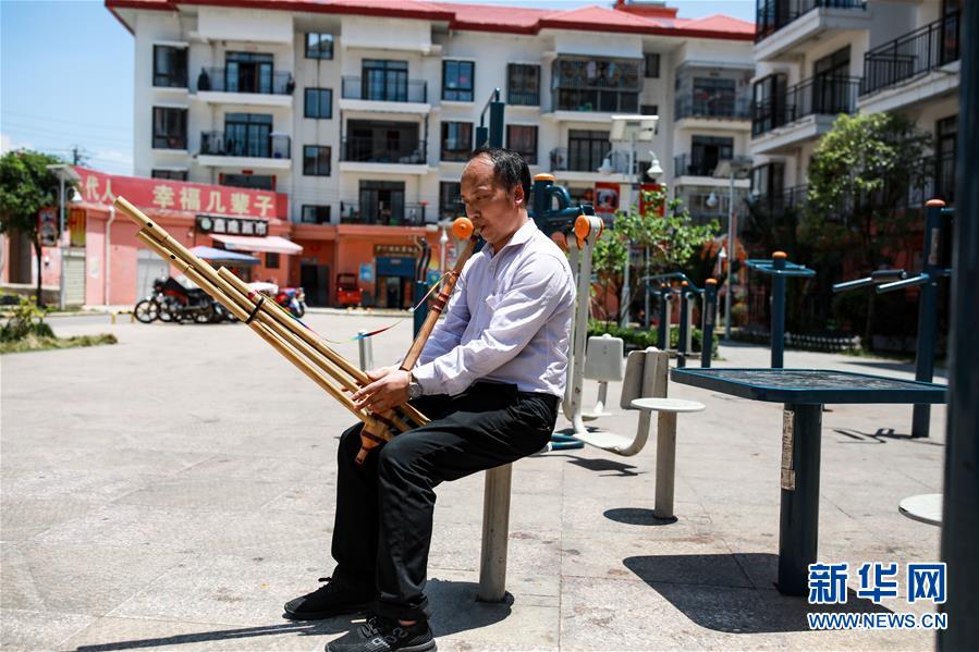 在贵州省惠水县明田街道易地扶贫搬迁项目新民社区,居民罗应和在新居旁吹芦笙(5月6日摄)。新华社记者欧东衢摄