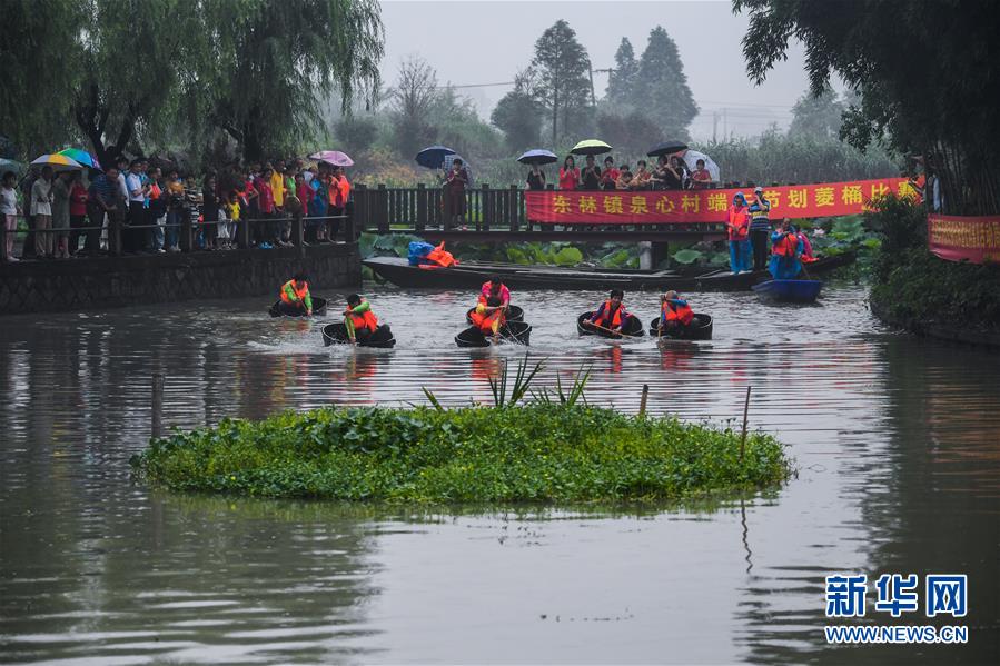 6月23日,东林镇村民在泉心村荷花池参加端午划菱桶趣味活动。当日,浙江省湖州市东林镇在泉心村荷花池举办“庆端午划菱桶”趣味活动。村民们划着菱桶在水面上你追我赶,同时采收荷花和莲蓬,呈现出水乡特有的端午节日氛围。在河网密布的东林镇,菱桶是水乡家家户户都有的一种传统水上劳动工具,村民在捕鱼、采菱、采荷时都要用到。新华社记者徐昱摄