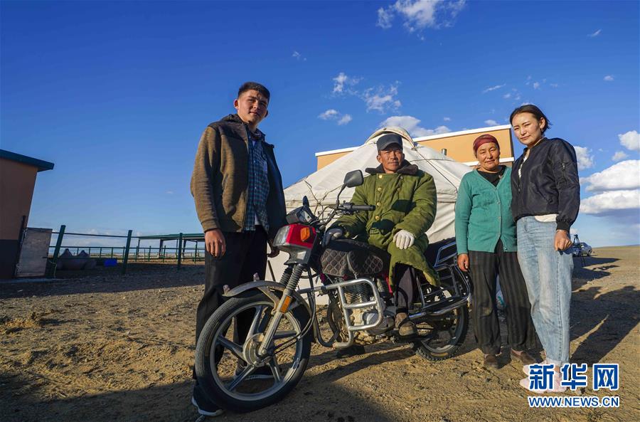 在吉木乃县万驼园内,牧民米拉木别克·阿依提克(左二)与家人在房前合影(6月21日摄)。新华社记者赵戈摄