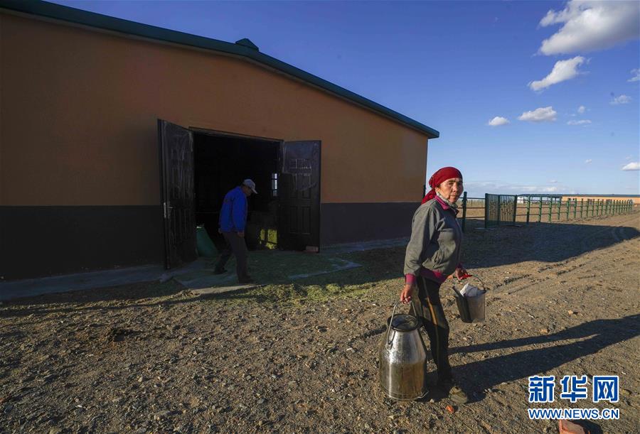 在吉木乃县万驼园内,一位牧民将刚收集的骆驼奶交到收奶处(6月21日摄)。新华社记者赵戈摄