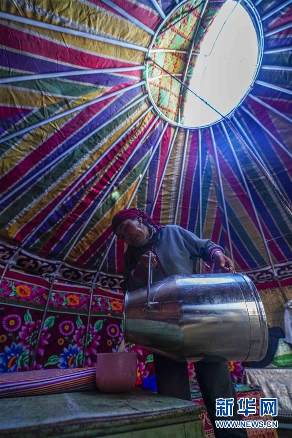 在吉木乃县万驼园内,一位牧民将一部分驼奶倒出留作自己食用(6月21日摄)。新华社记者赵戈摄