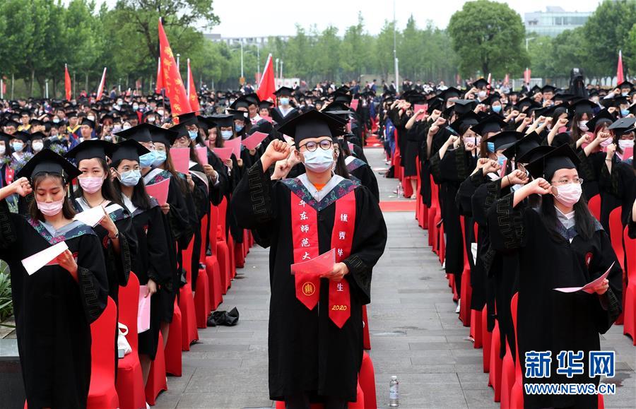 6月23日,在华东师范大学闵行校区的毕业典礼上,师范专业的毕业生举行宣誓仪式。当日,华东师范大学举行2020届毕业典礼。由于疫情防控需要,今年的典礼在两个校区分别举办,并全程在线直播。约7700名华东师范大学2020届毕业生通过现场或“云端”的方式参加毕业典礼。新华社记者刘颖摄
