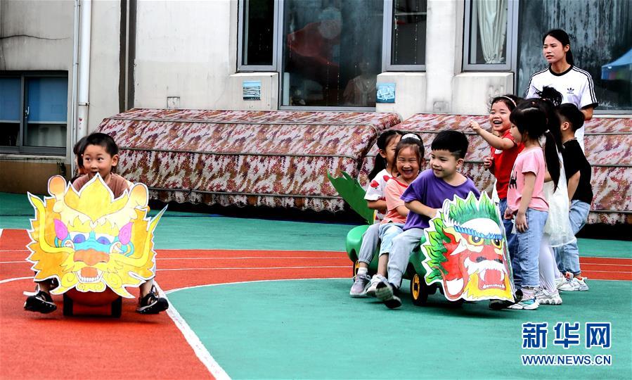 6月23日,长兴县李家巷镇中心幼儿园的孩子们一起在玩自创“划龙舟”游戏。为了迎接即将到来的端午节,浙江省湖州市长兴县各个幼儿园开展“品民俗迎端午”主题活动,让小朋友们体验传统民俗文化。新华社记者徐昱摄