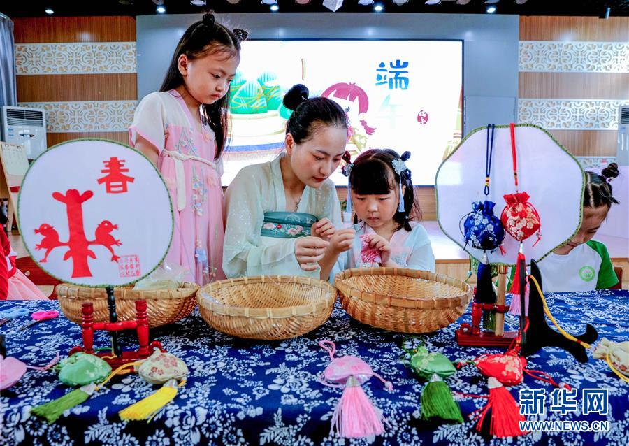 6月23日,长兴县李家巷镇中心幼儿园的孩子们在老师的带领下,一起制作端午香囊。为了迎接即将到来的端午节,浙江省湖州市长兴县各个幼儿园开展“品民俗迎端午”主题活动,让小朋友们体验传统民俗文化。新华社记者徐昱摄