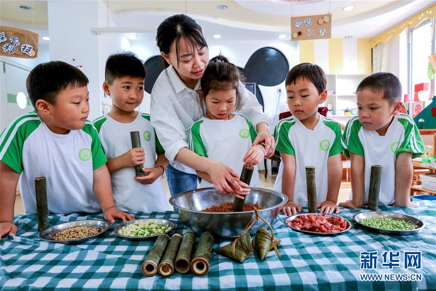6月23日,长兴县李家巷镇中心幼儿园的孩子们在老师的带领下,一起学习制作端午粽子和竹筒饭。为了迎接即将到来的端午节,浙江省湖州市长兴县各个幼儿园开展“品民俗迎端午”主题活动,让小朋友们体验传统民俗文化。新华社记者徐昱摄