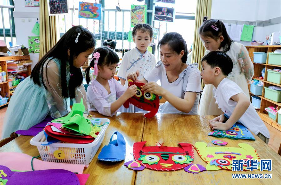 6月23日,长兴县开发区实验幼儿园的孩子们在教师指导下学做虎头鞋、虎头帽。为了迎接即将到来的端午节,浙江省湖州市长兴县各个幼儿园开展“品民俗迎端午”主题活动,让小朋友们体验传统民俗文化。新华社记者徐昱摄