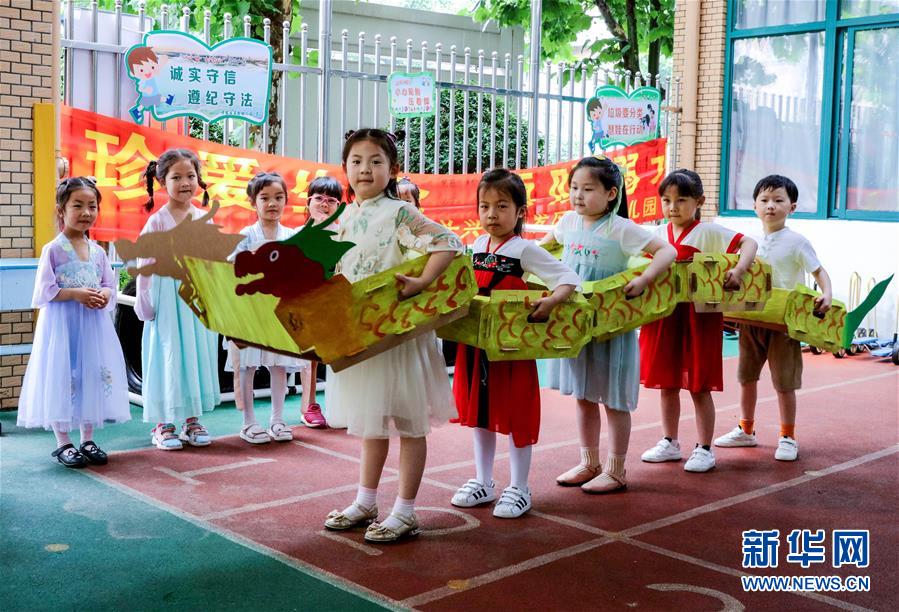6月23日,长兴县开发区实验幼儿园的孩子们用废旧的纸箱做成“龙舟”进行表演。为了迎接即将到来的端午节,浙江省湖州市长兴县各个幼儿园开展“品民俗迎端午”主题活动,让小朋友们体验传统民俗文化。新华社记者徐昱摄