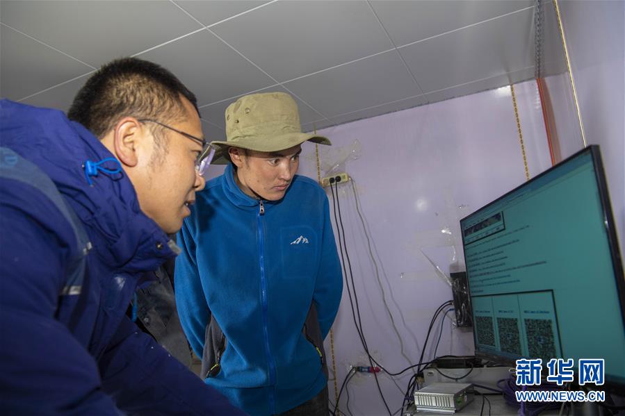 在中国科学院新疆天文台慕士塔格观测站,冯国杰(左)为助理观测员阿克力·图拉提讲解当晚观测要点(6月15日摄)。新华社记者胡虎虎摄