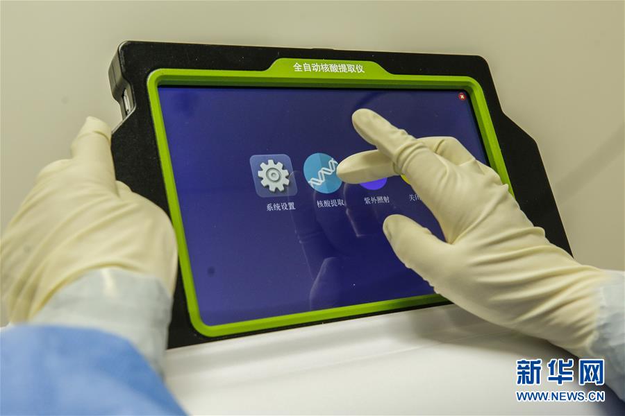 6月23日,检验人员操作全自动核酸提取仪。6月15日,北京市普仁医院PCR实验室正式启用,并立即投入到新冠肺炎病毒核酸检测工作之中,为新冠肺炎疫情防控增添利器。普仁医院PCR实验室启用以来,除了来自本院发热门诊、门急诊、病房和核酸检测采样点的样本之外,还承接了社区以及东城区集中核酸检测点采集的部分样本。新华社记者张玉薇摄