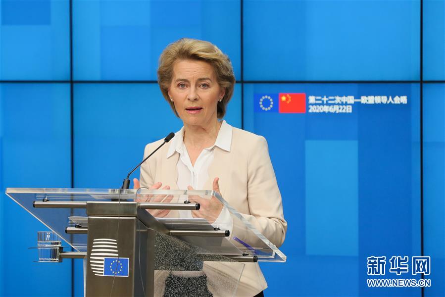 6月22日,欧盟委员会主席冯德莱恩在位于比利时布鲁塞尔的欧盟总部出席第二十二次中国-欧盟领导人会晤后举行的新闻发布会。