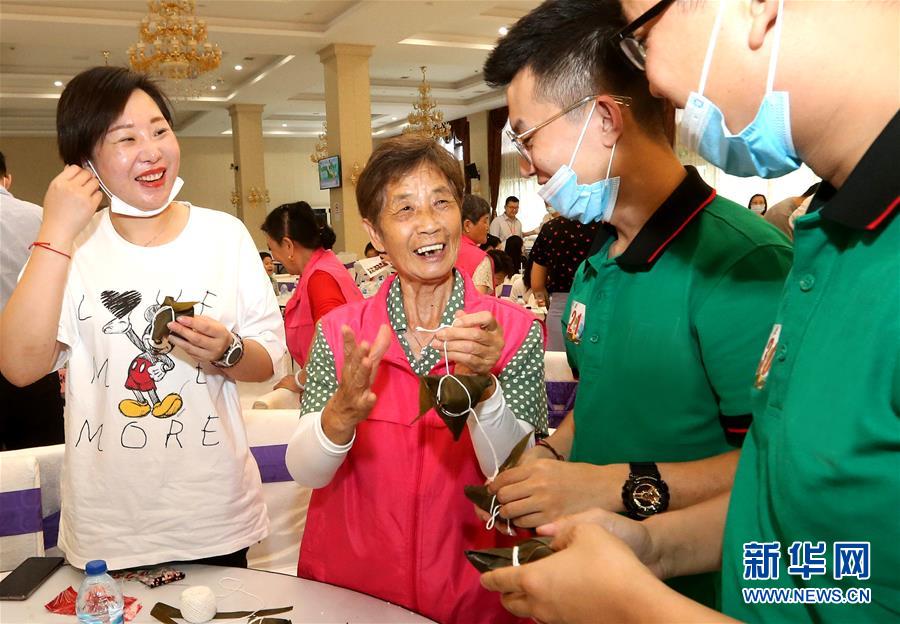 6月24日,上海一家企业员工和上海新虹桥街道社区居民一起包粽子迎端午。端午节临近,各地举行包粽子、做香包、赛龙舟等丰富多彩的民俗文化活动,迎接传统佳节的到来。新华社记者陈飞摄