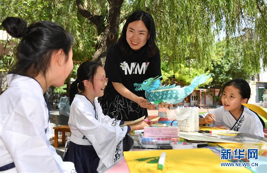 6月24日,西安市新城区后宰门小学的老师指导学生制作纸质龙舟模型。端午节临近,各地举行包粽子、做香包、赛龙舟等丰富多彩的民俗文化活动,迎接传统佳节的到来。新华社记者刘潇摄