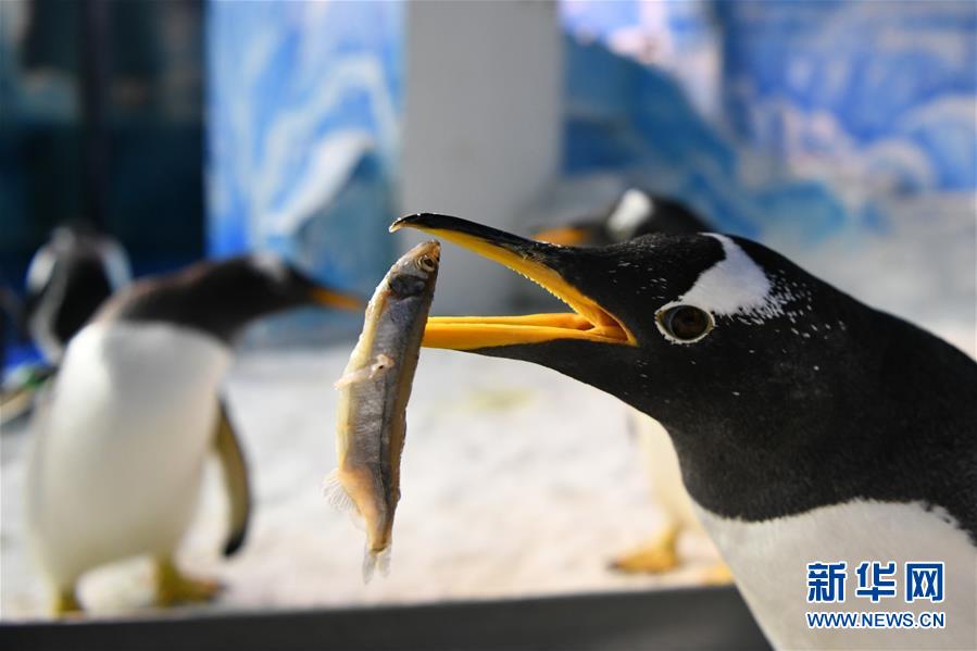 6月24日,哈尔滨极地馆的企鹅在品尝“鱼粽”里的小鱼。当日,哈尔滨极地馆的工作人员特地准备了“鱼粽”“肉粽”,让生活在这里的极地动物也品尝一下端午美食。新华社记者王建威摄