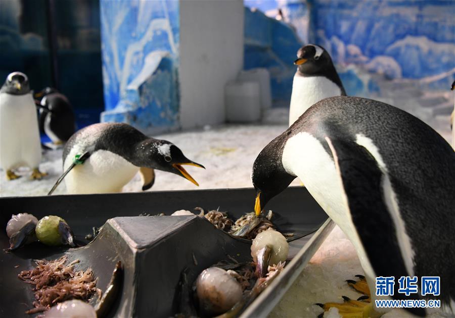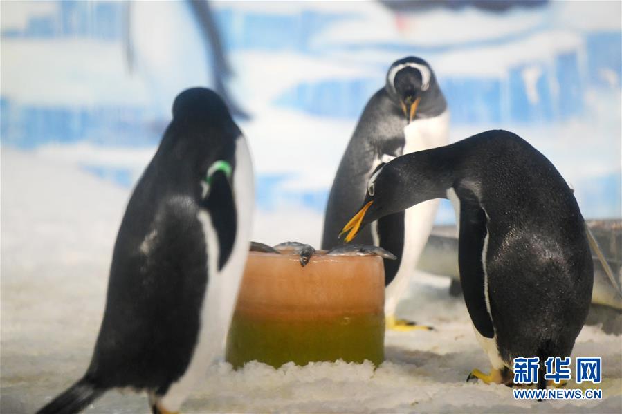 6月24日,哈尔滨极地馆的企鹅在享用工作人员送来的美食。当日,哈尔滨极地馆的工作人员特地准备了“鱼粽”“肉粽”,让生活在这里的极地动物也品尝一下端午美食。新华社记者王建威摄