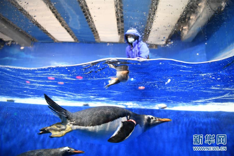 6月24日,哈尔滨极地馆的工作人员为水中的企鹅投放“鱼粽”。当日,哈尔滨极地馆的工作人员特地准备了“鱼粽”“肉粽”,让生活在这里的极地动物也品尝一下端午美食。新华社记者王建威摄