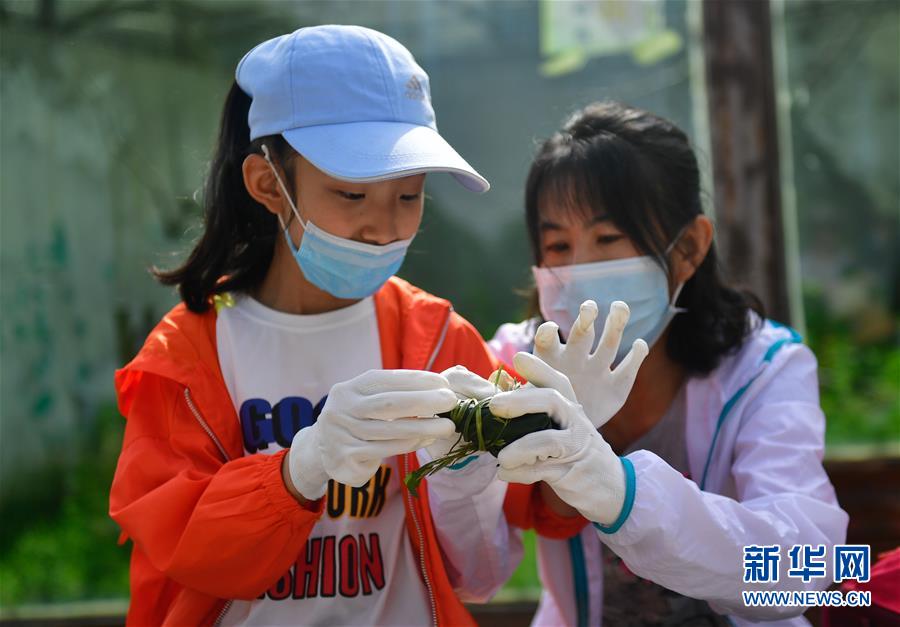 6月25日,在青海省西宁野生动物园,一位小朋友在母亲帮助下包粽子。新华社记者 张龙 摄