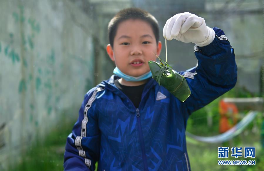 6月25日,在青海省西宁野生动物园,一位小朋友在展示自己包的粽子。新华社记者 张龙 摄