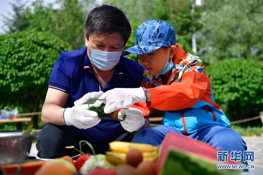 6月25日,在青海省西宁野生动物园,一位小朋友在父亲的帮助下包粽子。新华社记者 张龙 摄