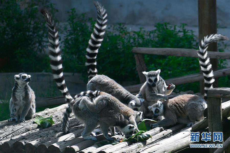 6月25日,在青海省西宁野生动物园,一群环尾狐猴在享用小朋友们包的粽子。新华社记者 张龙 摄