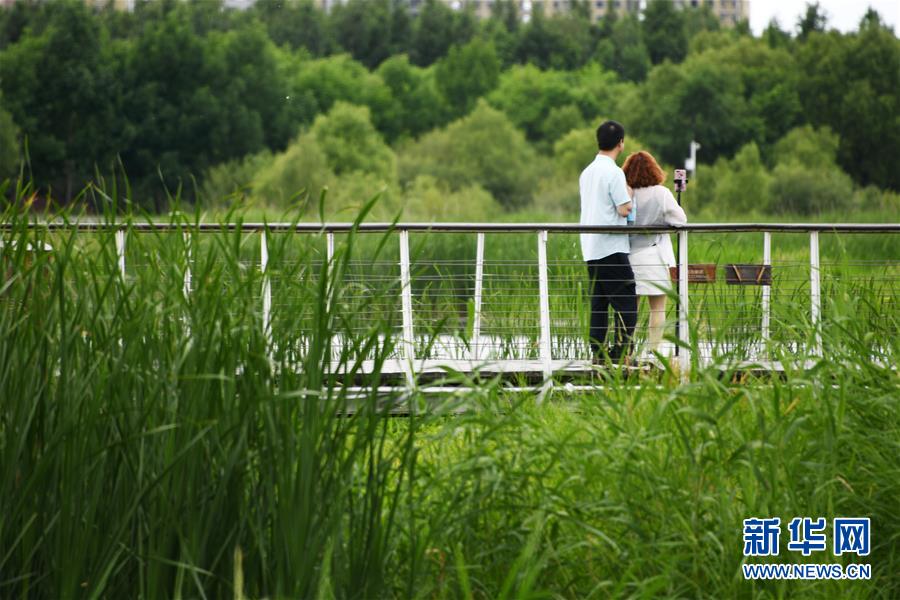 6月25日,市民在哈尔滨大剧院附近的湿地公园拍照。新华社记者 王建威 摄