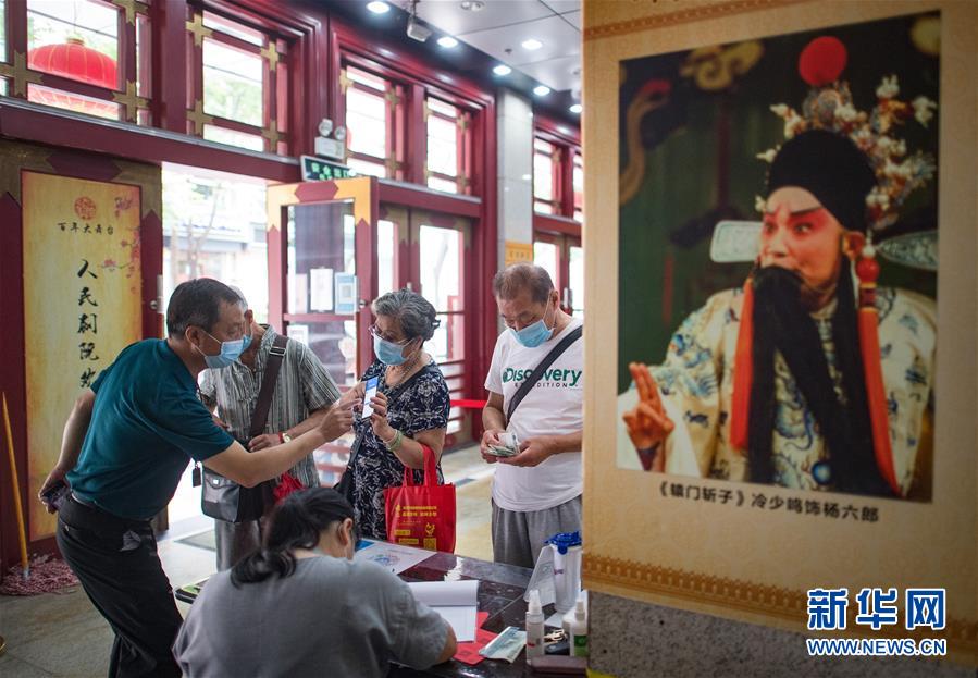 6月26日,市民扫健康码登记后进入武汉市人民剧院。当日,武汉市中心7家剧场恢复开放,各大文艺院团恢复线下演出,市民再次坐在剧场内观看“戏码头”上群星云集、百戏荟萃。新华社记者 肖艺九 摄
