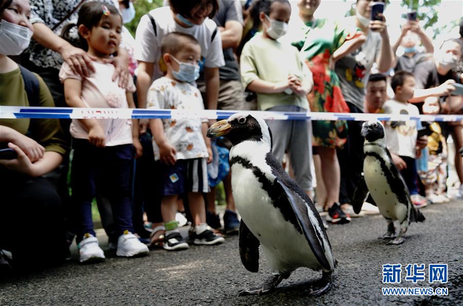 6月26日,上海动物园的企鹅在游客面前漫步。新华社记者 张建松 摄