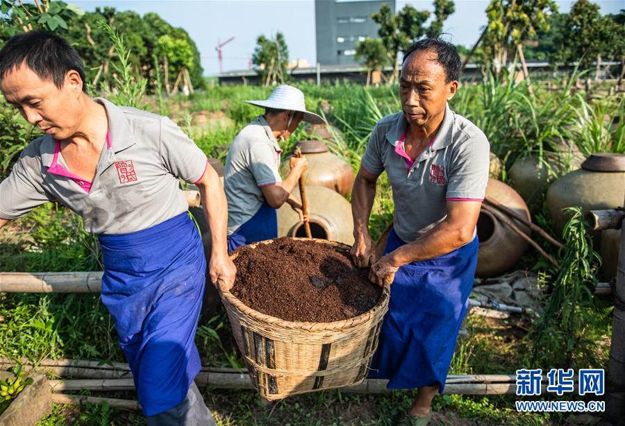 6月26日,工人在曾氏晒醋厂搬运醋醅。新华社记者 陶亮 摄