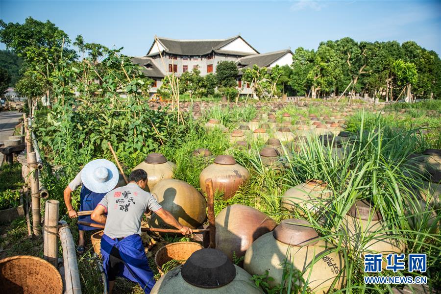 6月26日,工人在曾氏晒醋厂翻取醋醅。新华社记者 陶亮 摄
