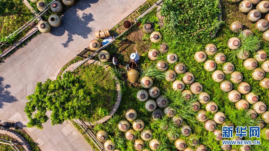 6月26日,工人在曾氏晒醋厂翻取醋醅(无人机照片)。新华社记者 陶亮 摄