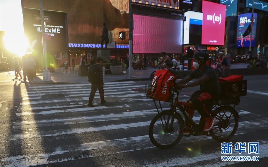6月27日,一名送货员骑车经过美国纽约时报广场。美国约翰斯·霍普金斯大学27日发布的新冠疫情最新统计数据显示,截至美国东部时间27日16时35分(北京时间28日4时35分),美国累计新冠确诊病例2500419例,累计死亡病例125434例。新华社记者王迎摄