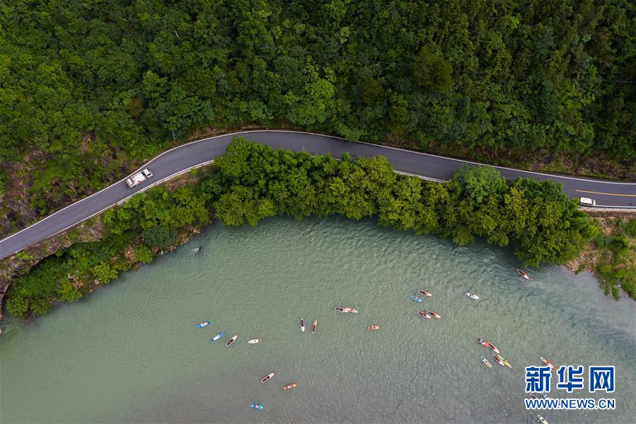 水上运动爱好者在杭州市富阳区湖源乡的壶源溪上体验桨板运动的乐趣(6月28日摄,无人机照片)。近期,浙江省杭州市富阳区场口镇、常安镇和湖源乡组团开启了一场夏季“绿水青山嘉年华”。这几个壶源溪流域乡镇整合生态旅游资源,组团开发山村旅游项目,游客可以参与壶源溪水上游乐、露营永安山顶、特色农产品集市和瓜果节等特色活动。新华社记者徐昱摄