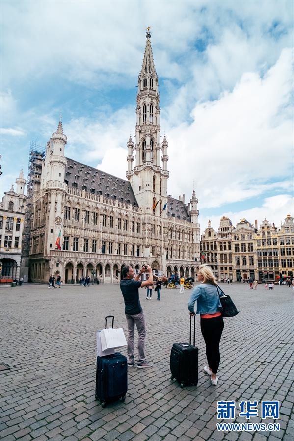 6月28日,两名来自英国的游客在比利时布鲁塞尔大广场游览。近日,随着欧盟国家间逐步开放边境,比利时布鲁塞尔游客逐渐增多。新华社记者张铖摄