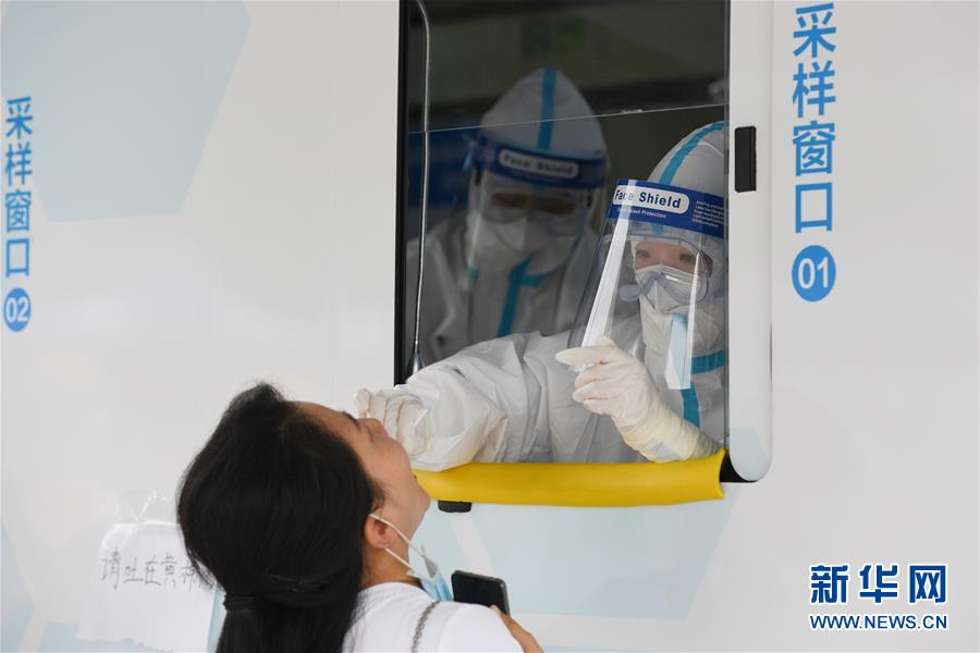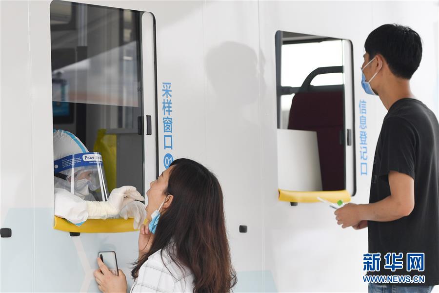 6月28日,在北京市西城区北京展览馆南侧的露天广场核酸检测采样点,核酸检测采样车内的医护人员为前来做检测的人员进行采样。新华社记者鞠焕宗摄