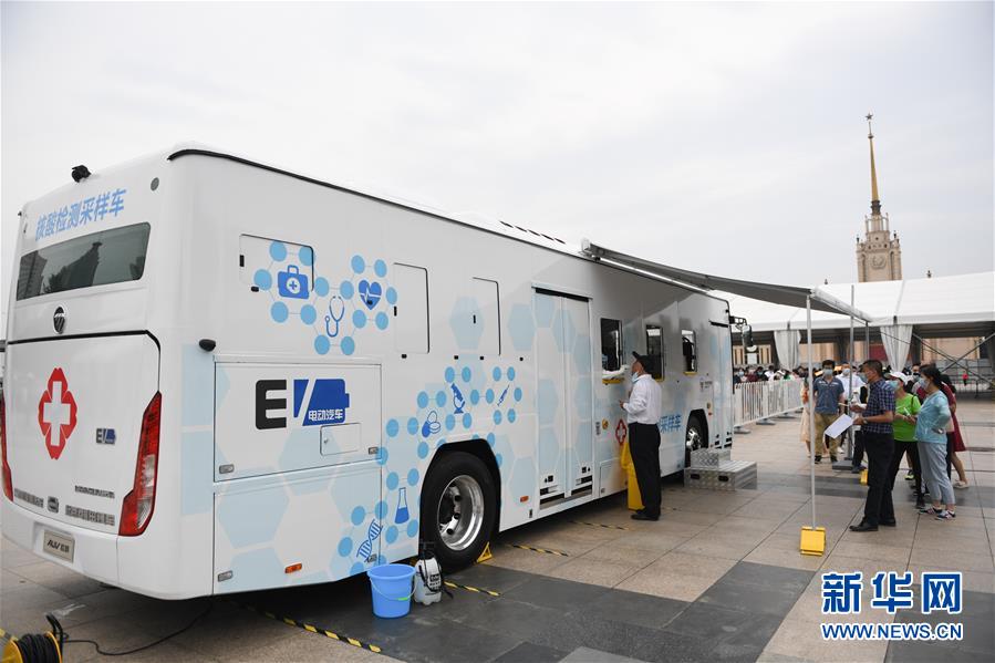 6月28日,在北京市西城区北京展览馆南侧的露天广场核酸检测采样点,前来做检测的人员在核酸检测采样车旁进行采样。新华社记者鞠焕宗摄