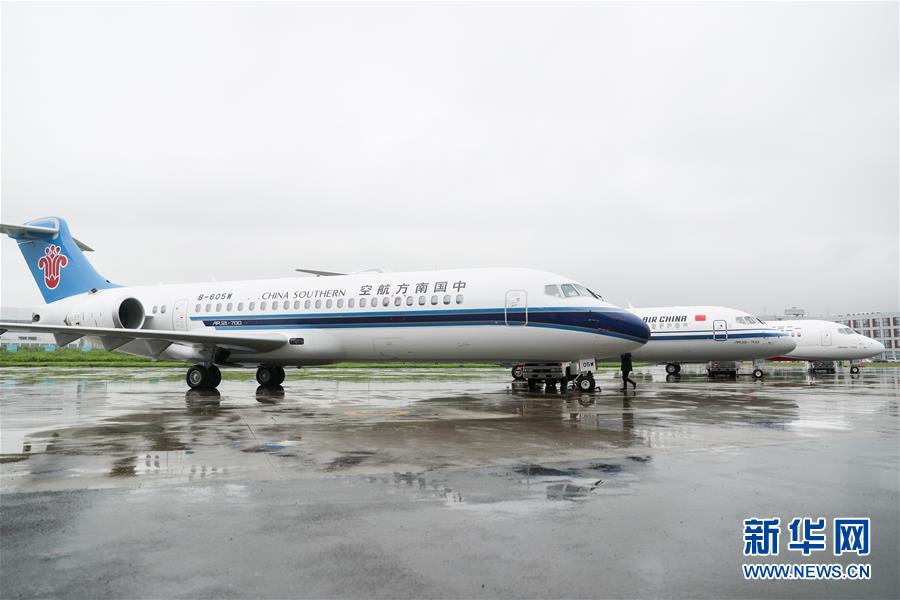 6月28日,三架崭新涂装的国产新支线客机ARJ21飞机停放在中国商用飞机有限责任公司总装基地内。当日,三架崭新涂装的国产新支线客机ARJ21飞机在位于上海浦东的中国商用飞机有限责任公司总装基地集结,分别交付给国航、东航、南航三大航空公司,标志着ARJ21进入我国主流民航市场。新华社记者丁汀摄