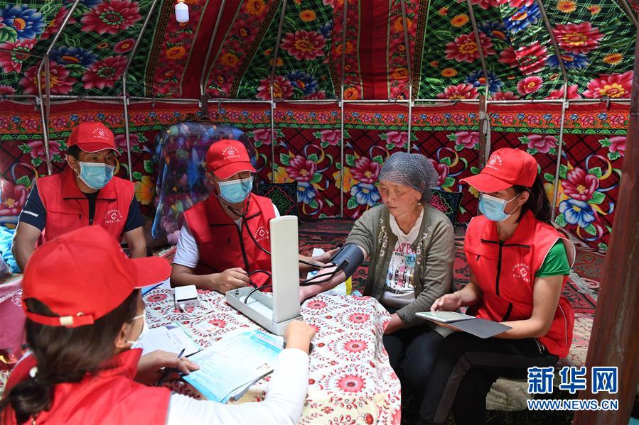 新疆布尔津县也格孜托别乡卫生院全科医生哈纳提别克·沙旦(右三)给牧民巴合提古丽·塔拉甫汗检查身体。新华社记者沙达提摄