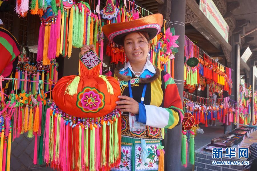 6月24日,绣娘胡兰索卡在青海省互助土族自治县举办的端午节香包“选美”大赛上展示她的作品。新华社记者解统强摄