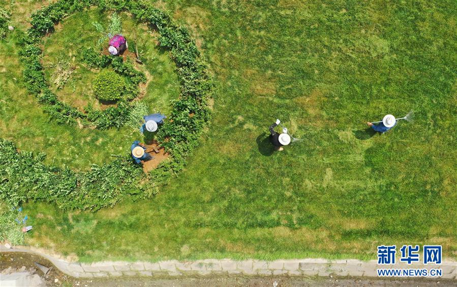 6月28日,园林工人在唐山至曹妃甸生态廊道内管护绿地(无人机照片)。近日,河北省唐山市唐山至曹妃甸生态廊道工程全线竣工。该生态廊道主要位于承唐高速及唐曹高速沿线,总长度约70公里,工程在整体风貌把握上充分尊重现状林、村庄、鱼塘、稻田、湿地等生态本底条件,因地制宜设计,成为一道亮丽的风景线。新华社记者牟宇摄