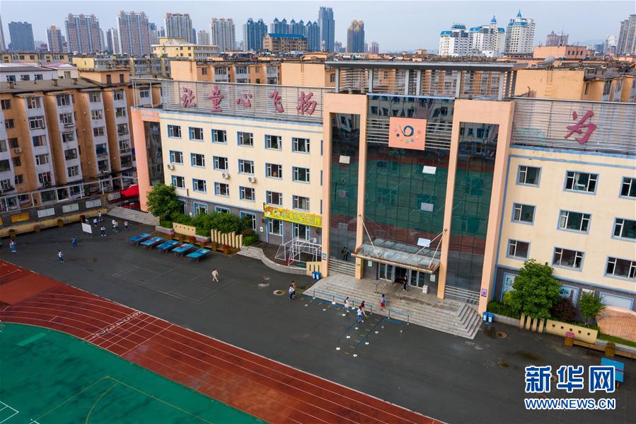 6月29日,在吉林市第一实验小学,学生陆续进入教学楼(无人机照片)。新华社记者张楠摄