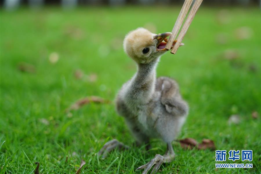 6月29日,工作人员在给蓑羽鹤宝宝喂食。新华社记者周密摄