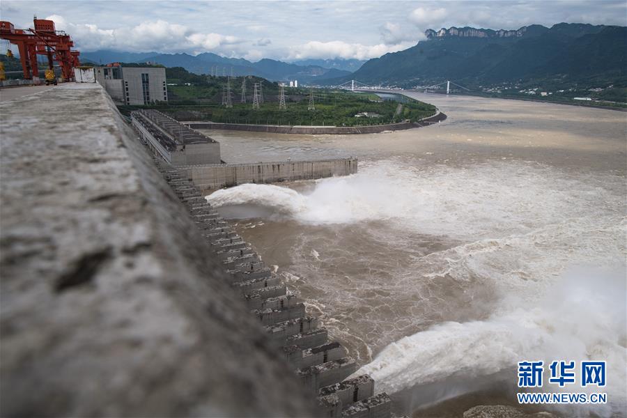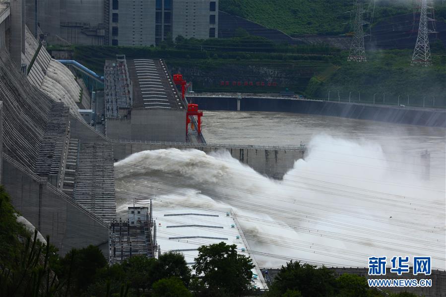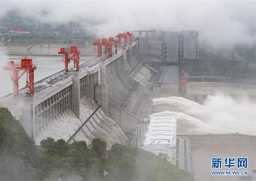 6月29日,三峡枢纽开启泄洪孔泄洪。受长江中上游强降雨影响,进入三峡水库的水量持续增多。为腾出一定库容迎接近期可能到来的洪水,三峡枢纽于6月29日上午开启两个泄洪孔,加大下泄流量。这是三峡枢纽今年首次泄洪。28日14时,三峡水库入库流量达4万立方米/秒,是27日14时的两倍。为应对此轮来水,长江防总要求将三峡水库下泄流量上调至日均3.5万立方米/秒。新华社发(黄善军摄)