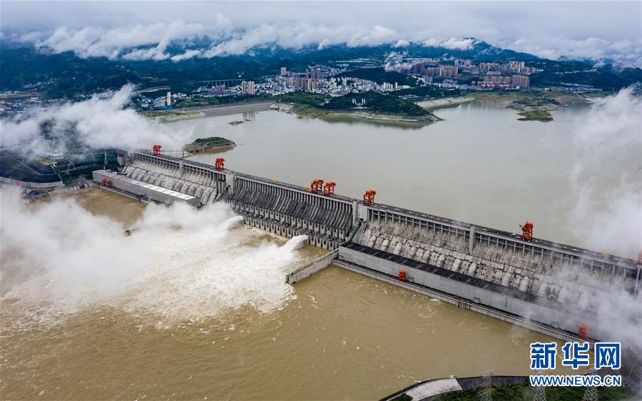 6月29日,三峡枢纽开启泄洪孔泄洪(无人机照片)。受长江中上游强降雨影响,进入三峡水库的水量持续增多。为腾出一定库容迎接近期可能到来的洪水,三峡枢纽于6月29日上午开启两个泄洪孔,加大下泄流量。这是三峡枢纽今年首次泄洪。28日14时,三峡水库入库流量达4万立方米/秒,是27日14时的两倍。为应对此轮来水,长江防总要求将三峡水库下泄流量上调至日均3.5万立方米/秒。新华社发(黄善军摄)