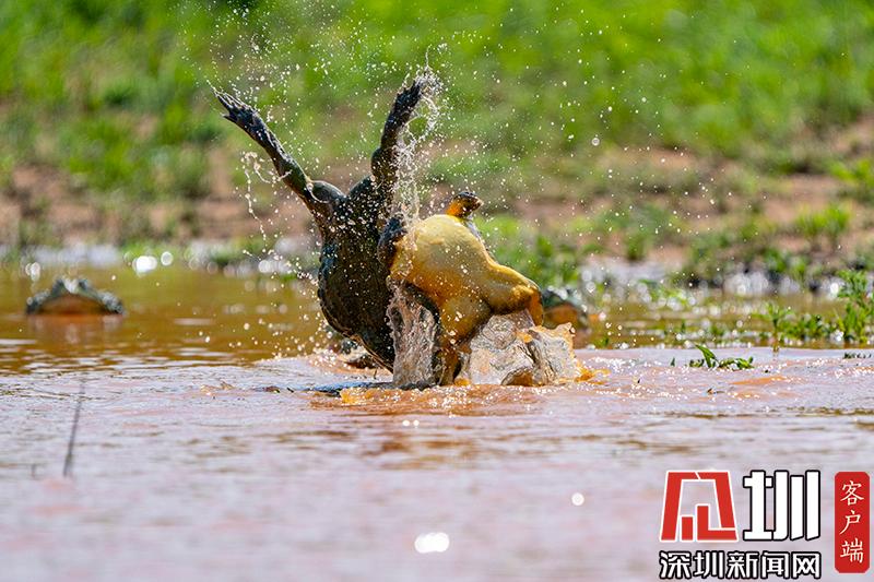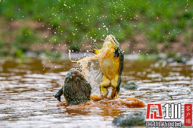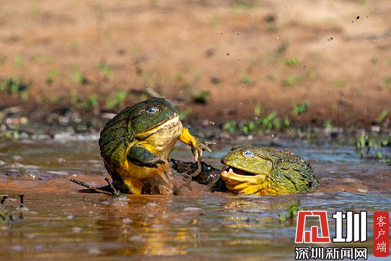 2020年6月30日报道(具体拍摄时间不详),南非波罗克瓦克,两只雄性非洲牛蛙为了争夺雌性牛蛙,在池塘中打架,这样的情形十分罕见。画面中,战况十分激烈,一只非洲牛蛙在另外一只试图逃到池塘边缘时撕咬对手,甚至将另外一只抛向空中。这些精彩的照片是由南非开普敦摄影师Temujin Johnson拍摄的。
