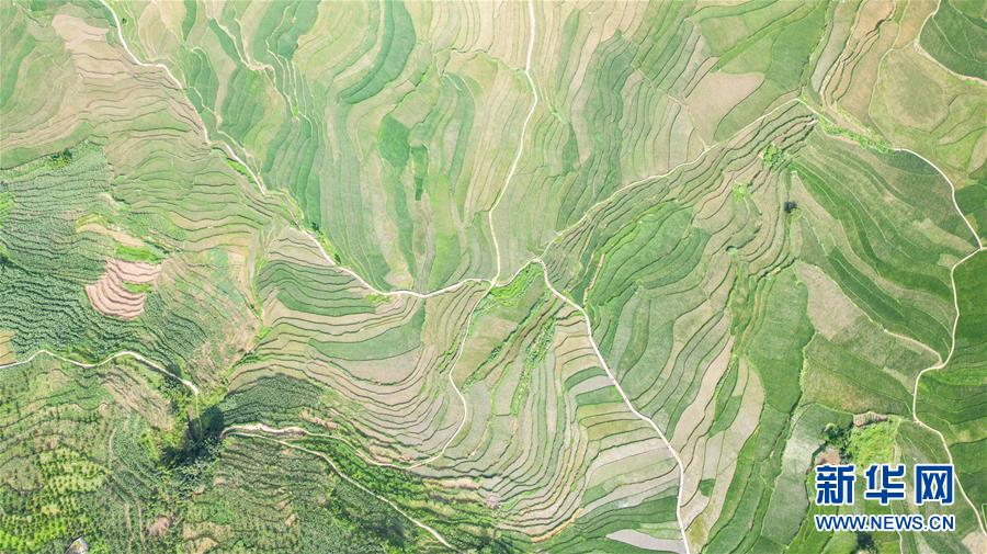 贵州省盘州市新民镇的梯田风光(6月29日摄,无人机照片)。夏日时节,贵州省盘州市新民镇的梯田风景如画。新华社记者陶亮摄
