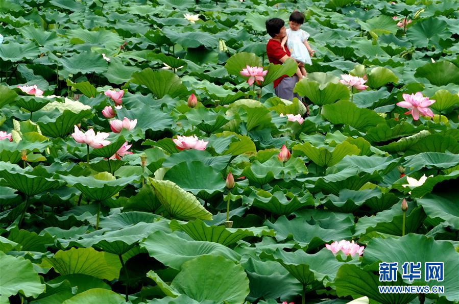 6月30日,市民在河南郑州紫荆山公园内观赏荷花。新华社记者李安摄