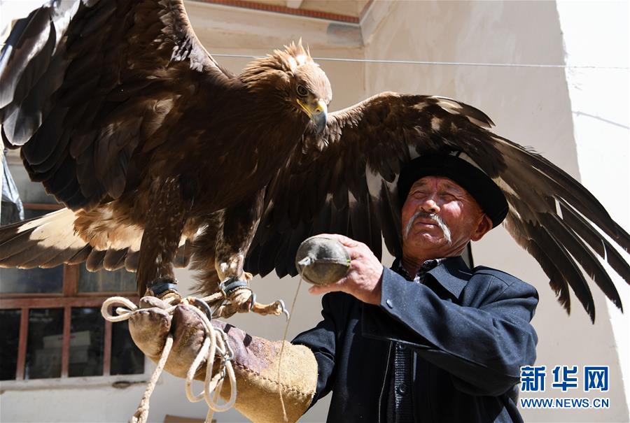 6月27日,库尔马西·胡特曼取下猎鹰的眼罩。驯鹰人平时会给猎鹰戴上眼罩,一般只有在猎鹰进食、捕猎的时候才会取下。新华社记者宋彦桦摄